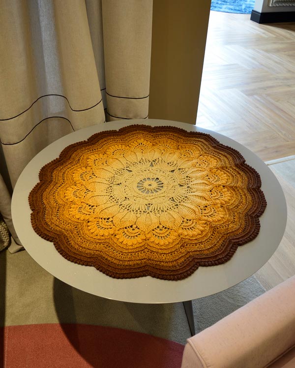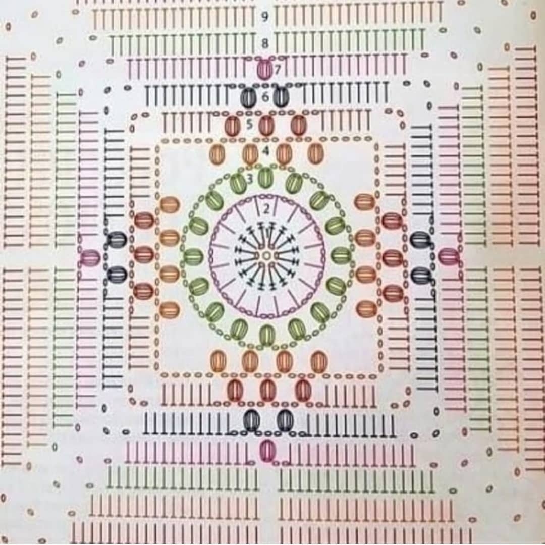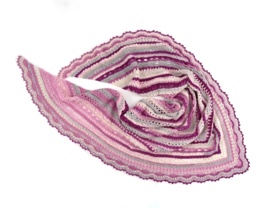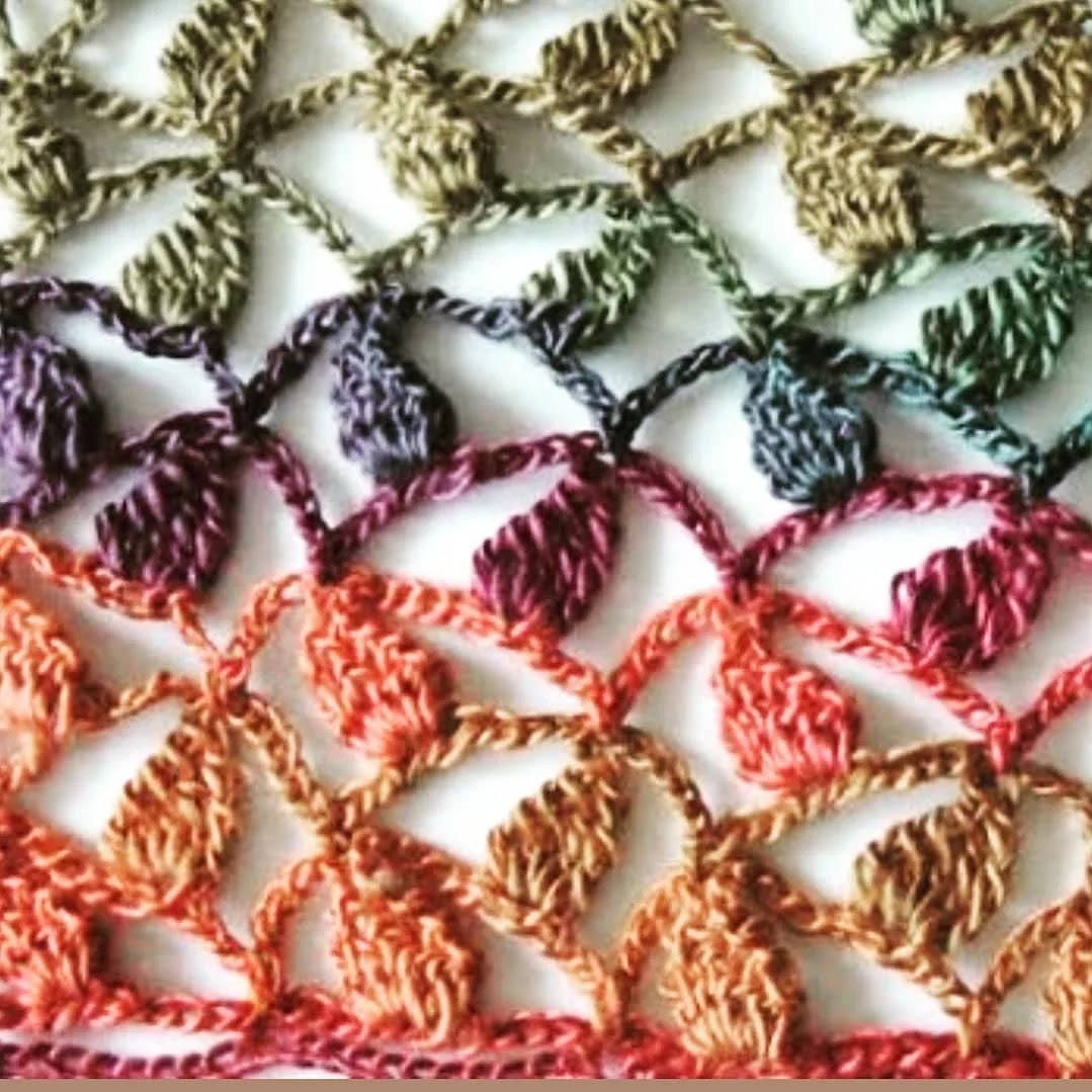 Matériaux utilisés: 3 Echeveaux de Baroque Maxcolor 400g Cru (7684) ; 1 écheveau de Quartz rose Maxcolor 400g (3390), vert militaire (5718), vert (5669), jaune (1449), carrelage (4707), violet (6394) et bleu sérénité (6823); Aiguille à crochet de 4,0 mm.