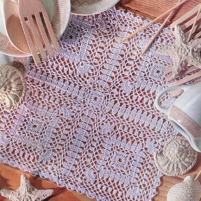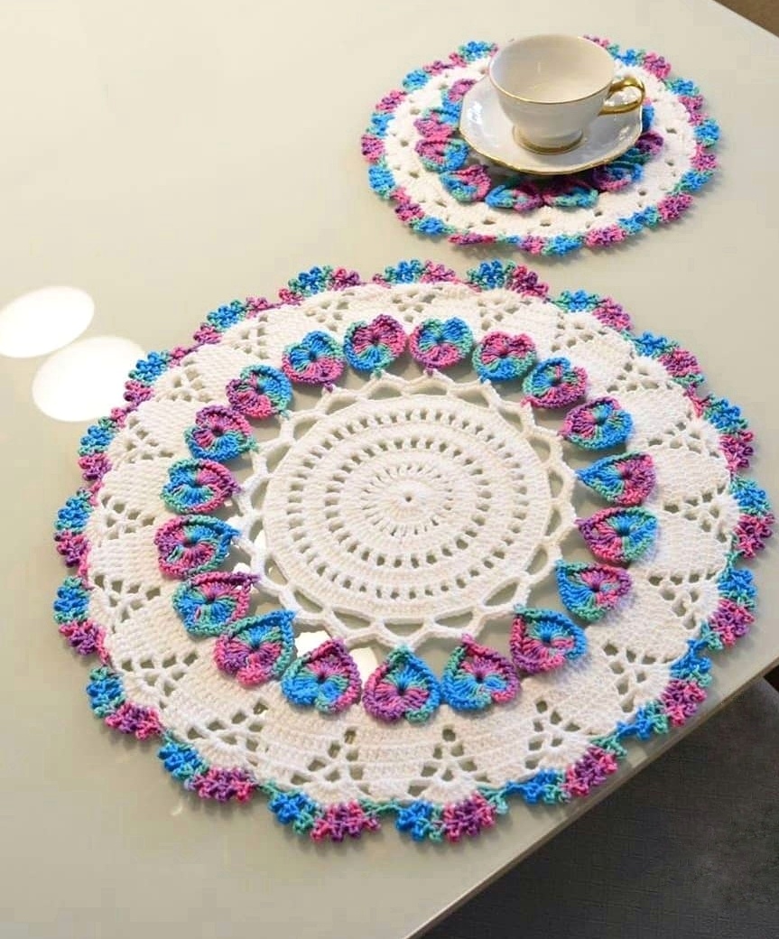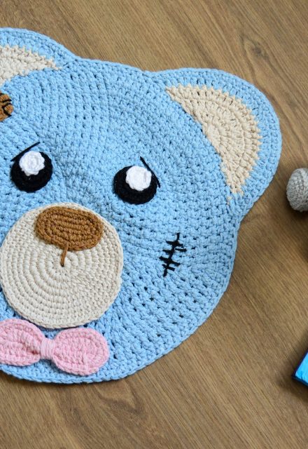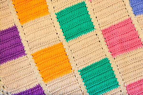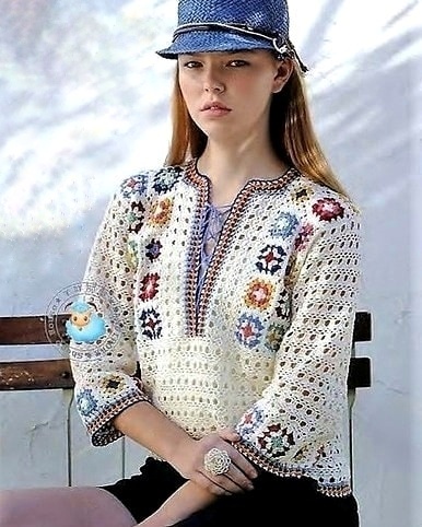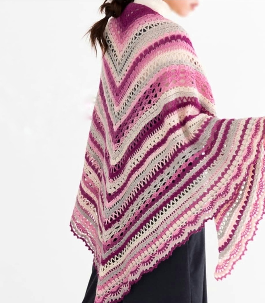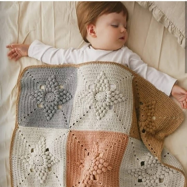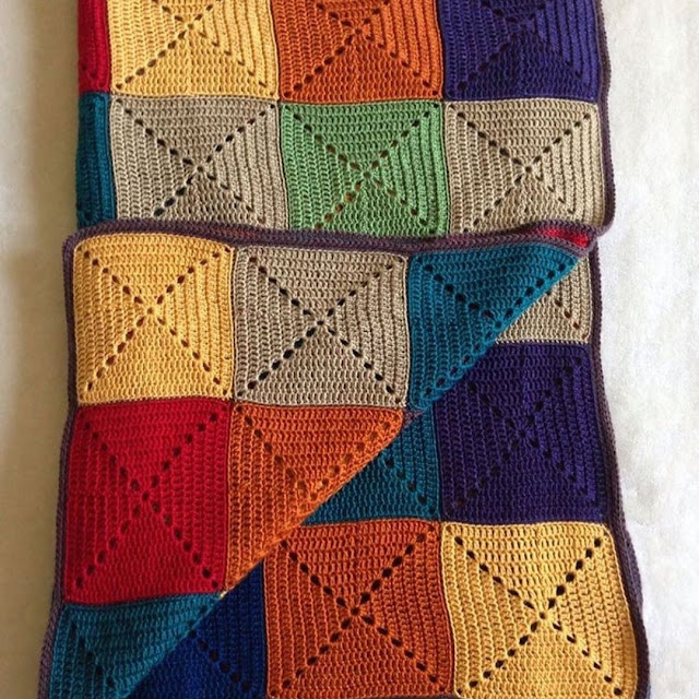 Matériaux utilisés: 3 Echeveaux de Baroque Maxcolor 400g Cru (7684) ; 1 écheveau de Quartz rose Maxcolor 400g (3390), vert militaire (5718), vert (5669), jaune (1449), carrelage (4707), violet (6394) et bleu sérénité (6823); Aiguille à crochet de 4,0 mm.