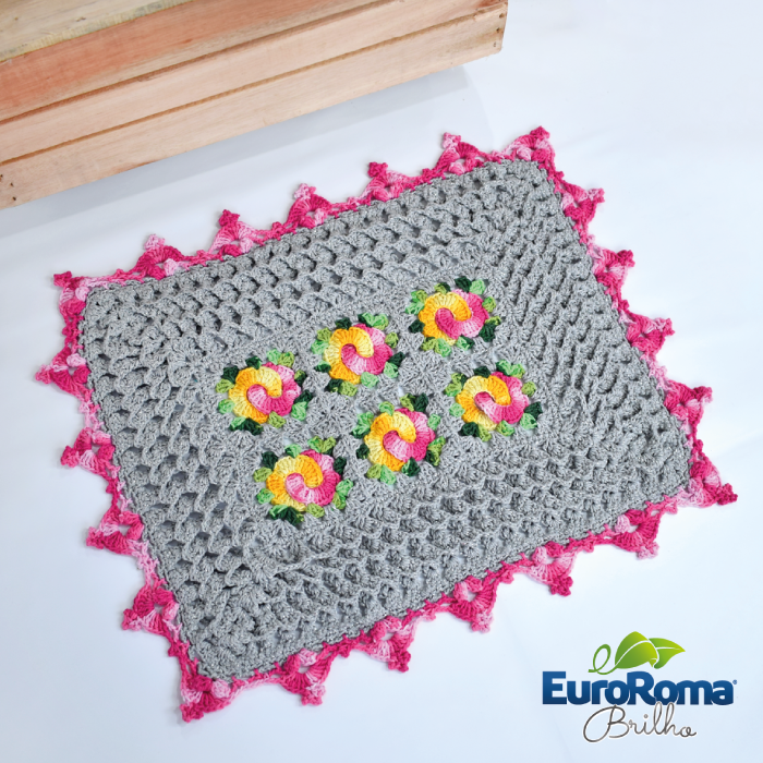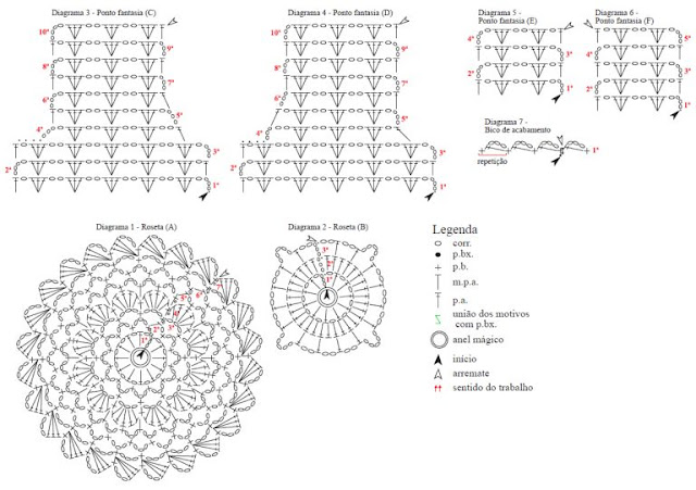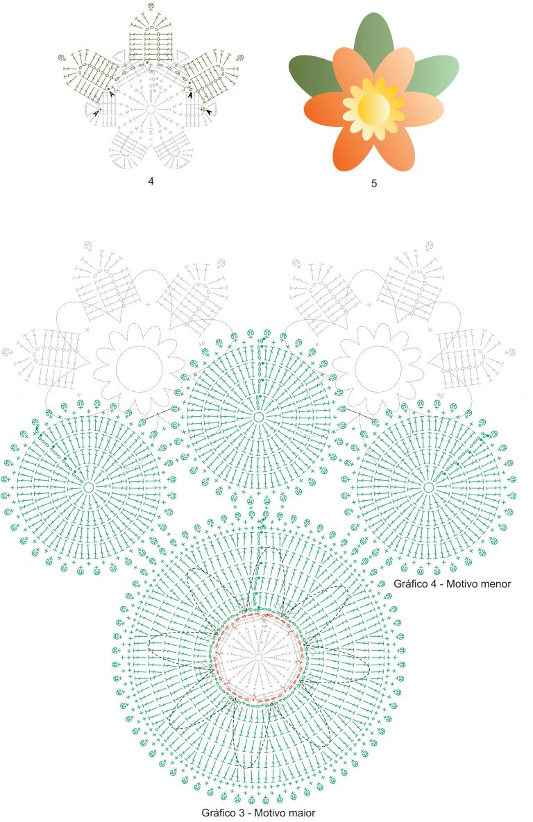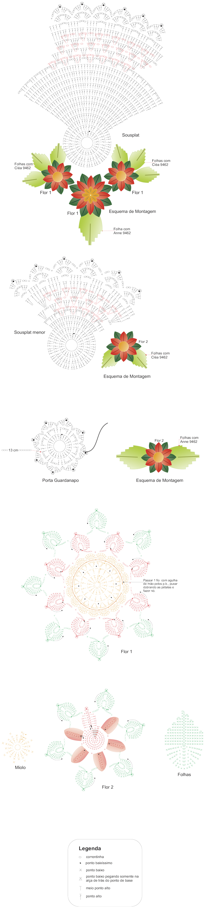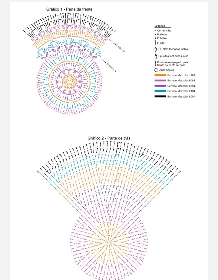 Matériel utilisé : Barroco Multicolor Premium 400g – 1 novelo de cada cor : 9368 (Raio de Sol), 9059 (Abóbora), 9218 (Calêndula) et 9392 (Folha) Barroco Maxcolor 4/6 400g – 1 novelo na cor : 5767 (Bandeira) Crochet N°4,00 mm 9 grandes pérolas Cola Universel.