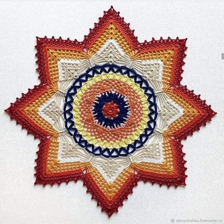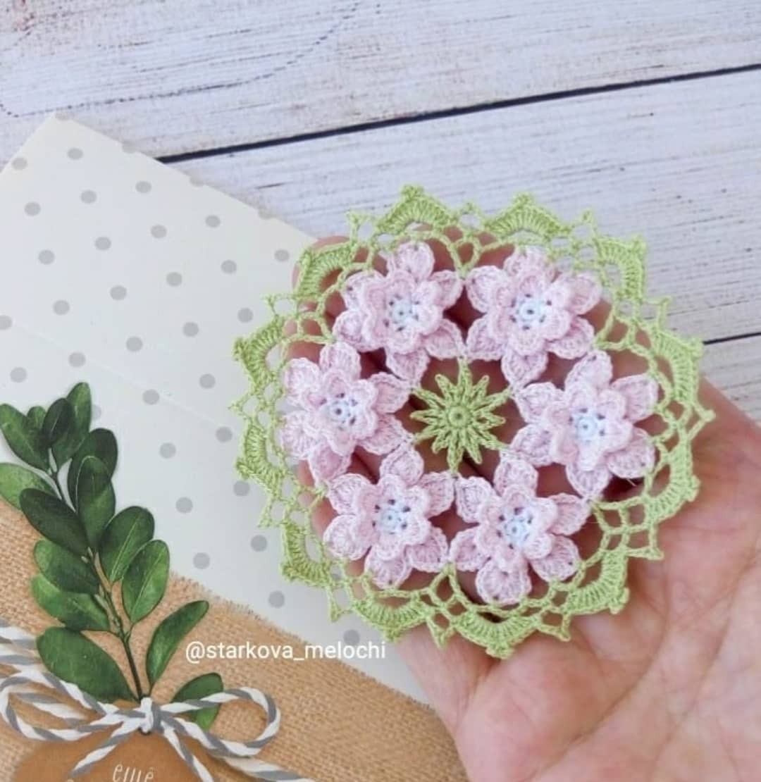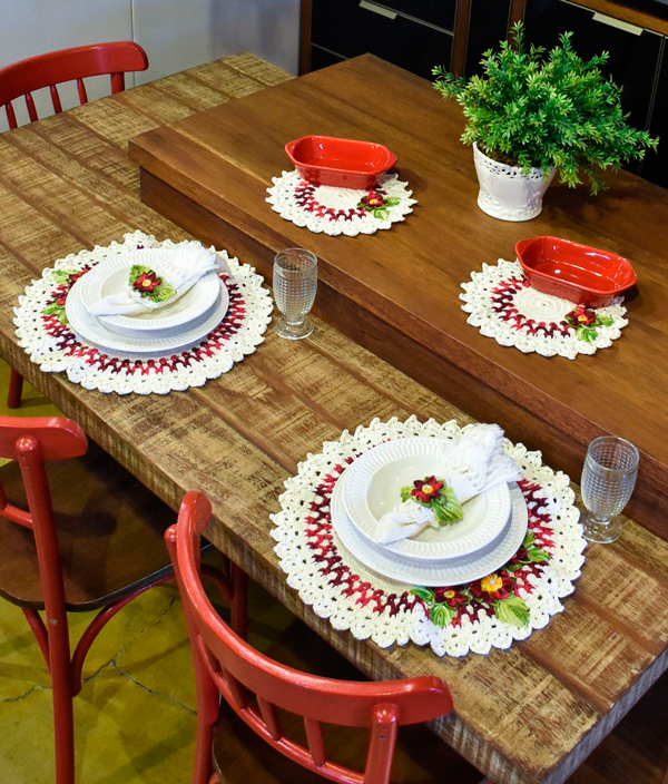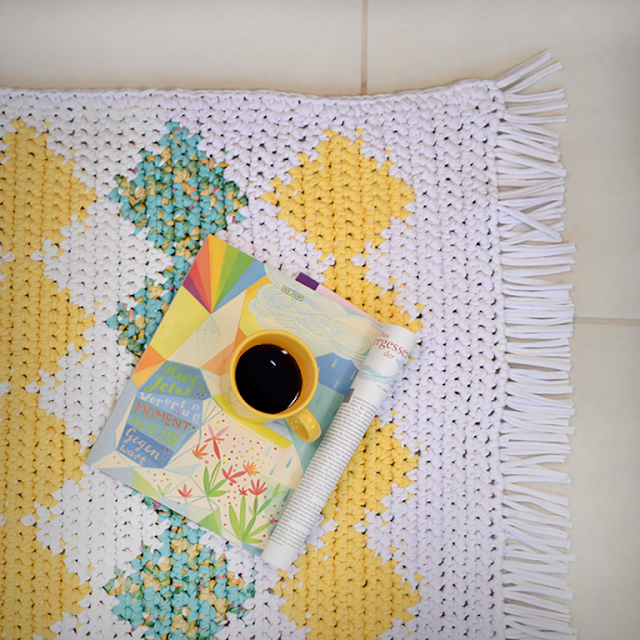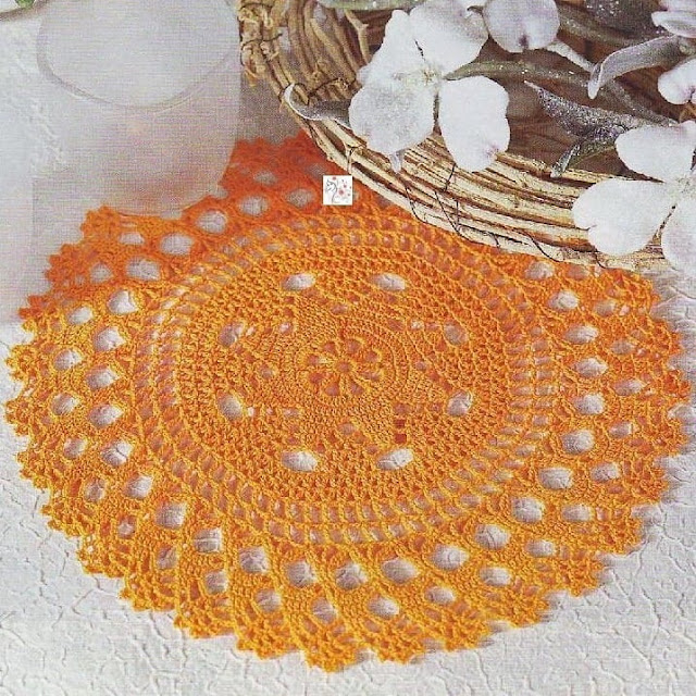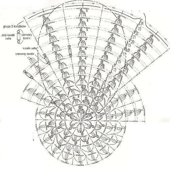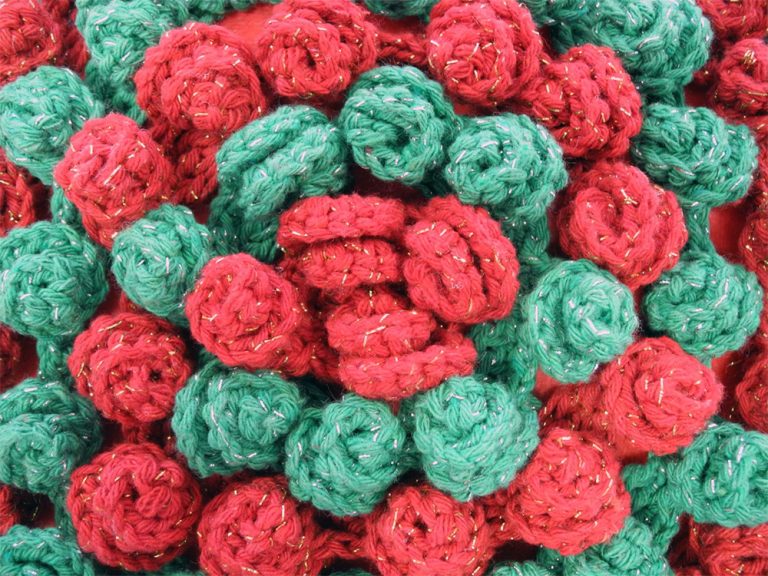 Matériel utilisé : Barroco Multicolor Premium 400g – 1 novelo de cada cor : 9368 (Raio de Sol), 9059 (Abóbora), 9218 (Calêndula) et 9392 (Folha) Barroco Maxcolor 4/6 400g – 1 novelo na cor : 5767 (Bandeira) Crochet N°4,00 mm 9 grandes pérolas Cola Universel.